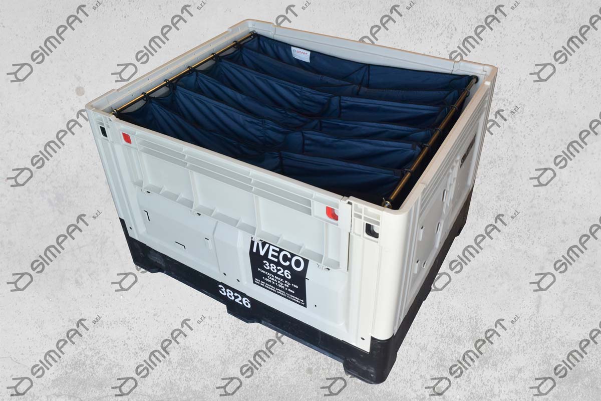 Contenitori plastici abbattibili con alveoli tessili, specifici per il trasporto di elementi delicati.